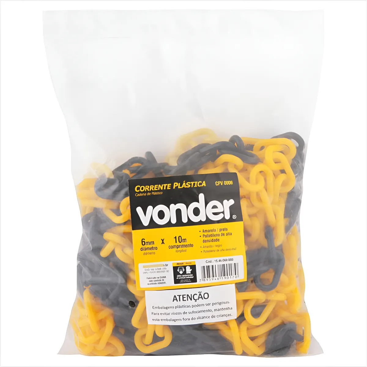 DESCRIÇÃO Indicada para isolar e delimitar áreas em geral, nunca utilizar para elevação, amarração ou arraste de carga. Fabricada em PEAD (polietileno de alta densidade), garantindo durabilidade e resistência. ESPECIFICAÇÕES Massa aproximada (peso): 75 g Largura interna do elo da corrente: 8,0 mm Comprimento interno do elo da corrente: 25,0 mm Diâmetro do elo da corrente (mm): 6,0 mm Cor da corrente plástica: Amarela / preta Material: Polietileno de alta densidade