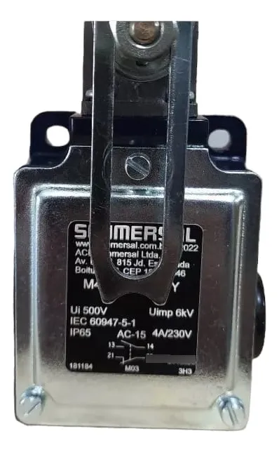 M4VH 007-11Y Fim de Curso SCHMERSAL Código: 181169 Metálica Alavanca com roldana em termoplástico Arranjo dos contatos: 1NA+1NF Capacidade dos contatos: 10A Grau de proteção: IP 67